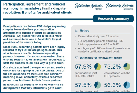 Our latest research summary reports on the outcomes of our recent study into the participation, rates of agreement, and levels of satisfaction and acrimony for separating couples who are ‘ambivalent’ about attending FDR.