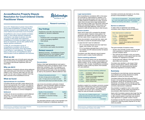 ‘Our findings will help RAV ensure that AccessResolve supports property dispute resolution for as many court-ordered clients as possible, so that they can avoid returning to court.’ – Dr Genevieve Heard (Manager Research).